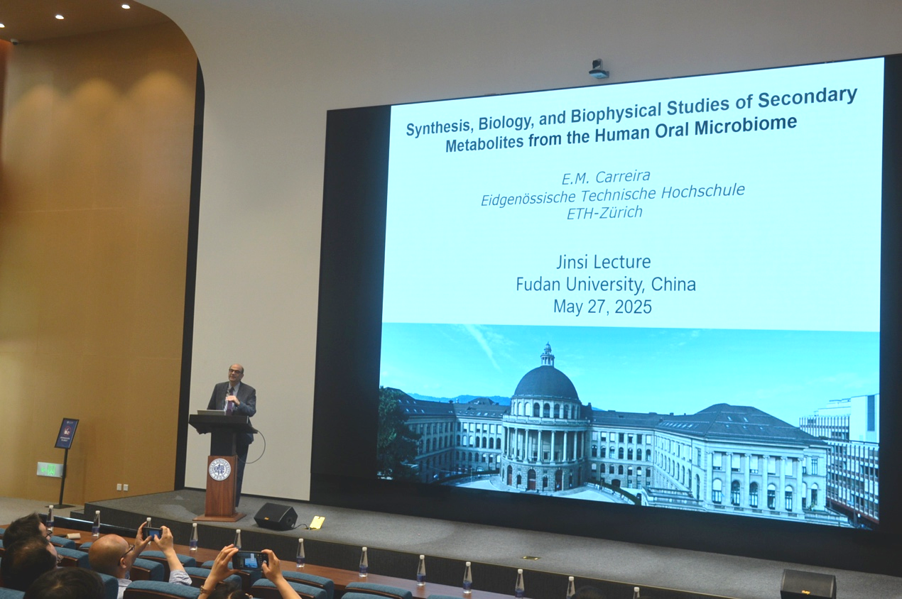 5月27日,复旦大学120周年校庆当天,bet365中国 “近思讲坛”第三十四讲在江湾校区化学楼周林林报告厅顺利举行。美国科学院院士、Journal of the American Chemical Society主编、瑞士苏黎世联邦理工学院化学与应用生物科学系Erick M.Carreira教授应邀作了一场题为“Synthesis, Biology, and Biophysical Studies of Secondary Metabolites from the Human Oral Microbiome”的学术报告,并对复旦大学建校120周年致以诚挚的祝福。本次报告会由bet365中国 主任周鸣飞主持。