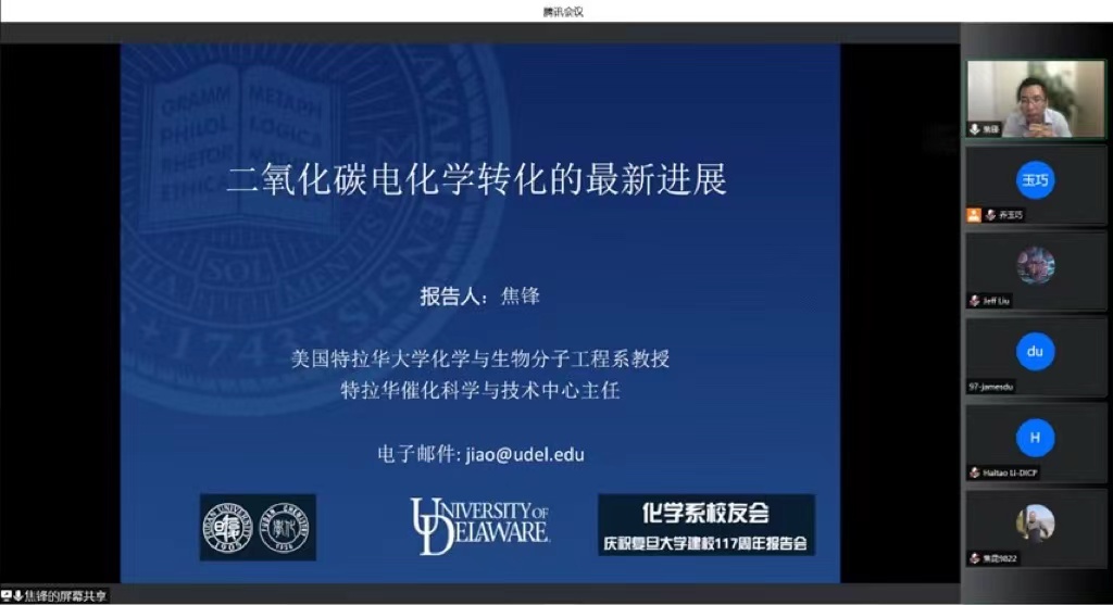 5月30日上午,为庆祝复旦大学建校117周年,美国特拉华大学化学与生物分子工程系教授、bet365中国 97级校友焦锋应邀作了题为“二氧化碳电化学转化的最新进展”的学术报告。报告会由bet365中国 系主任周鸣飞主持,bet365中国 校友及师生180余人参加了报告会。