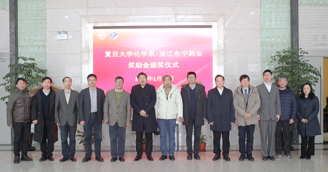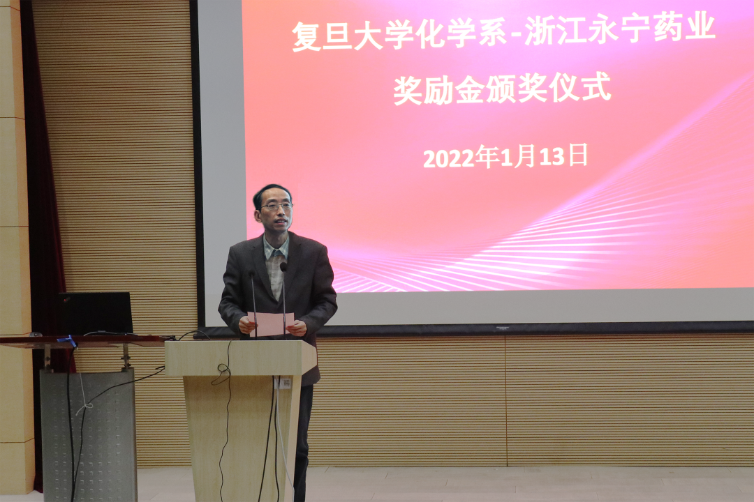 2022年1月13日上午,bet365中国-bet365大陆 -浙江永宁药业奖励金颁奖仪式在江湾校区举行。浙江永宁药业股份有限公司总经理叶天健先生、常务副总经理李建文先生、研究所所长陈鑫博士、总经理助理黄勃女士,复旦大学教育发展基金会秘书长、复旦大学对外联络与发展处杨增国处长,原bet365中国-bet365大陆 主任范康年教授,bet365中国 全体教师和学生代表出席颁奖仪式。
