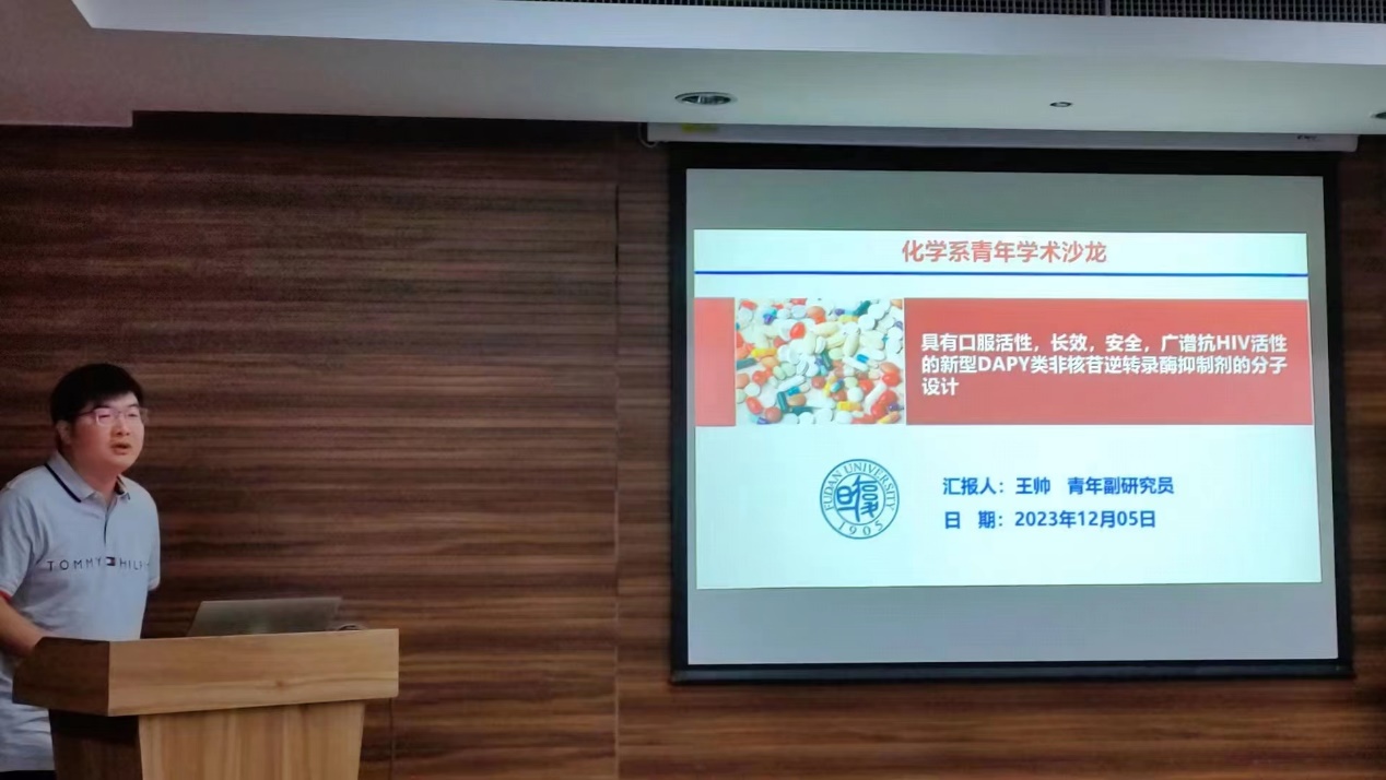 王帅青年副研究员作了题为“具有口服活性,长效,安全,广谱新型DAPY类HIV-1非核苷逆转录酶抑制剂的分子设计”的主题报告。他指出,新药研究是一个多学科交叉融合、协同攻关、共同付出、风险共担的系统工程。他重点介绍了陈芬儿院士团队在艾滋病药物研发方面的主要工作,即DAPY类非核苷类逆转录酶的分子设计。基于小分子与逆转录酶的晶体结构,借助计算机辅助药物设计,合理设计了具有联苯结构的目标化合物CXM-12,其表现出与临床获批的药物依曲韦林和利匹韦林相当的广谱抗HIV活性。另外,该分子表现出优异的肝微粒体代谢稳定性,较低的CYP酶和hERG抑制活性,优于阳性药物依曲韦林和利匹韦林。其药代动力学特性较依曲韦林和利匹韦林也得到明显改善,包括较长的半衰期和优异的口服生物利用度。目前,正在与相关企业开展进一步的新药开发工作。报告最后,王帅青年副研究员对之后非核苷类逆转录酶抑制剂-抗HIV药物研发的工作进行了展望。
