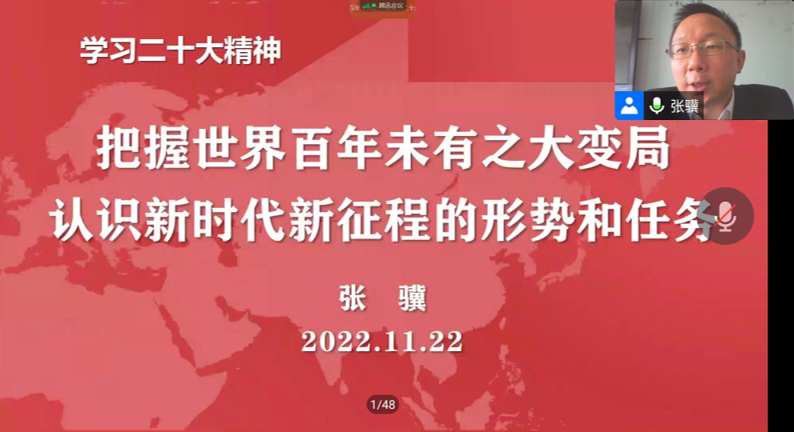为深入学习贯彻党的二十大精神,11月22日下午,bet365中国 党委邀请复旦大学党的二十大精神宣讲团成员、国际关系与公共事务学院副院长张骥教授作宣讲报告,主题为“把握世界百年未有之大变局,认识新时代新征程的形势和任务”。本次宣讲报告会由bet365中国 分党委副书记刘永梅主持,bet365中国 全体教职工和bet365中国 全体学生党员共计480余人参加了本次学习。