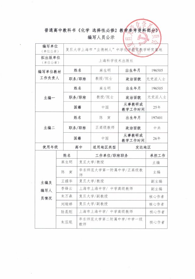 普通高中教科书《化学 选择性必修2 教学参考资料部分》编写人员公示