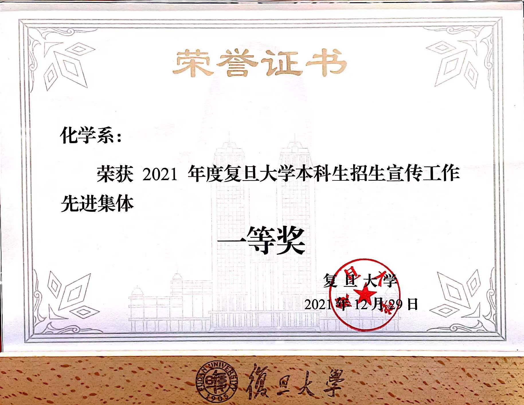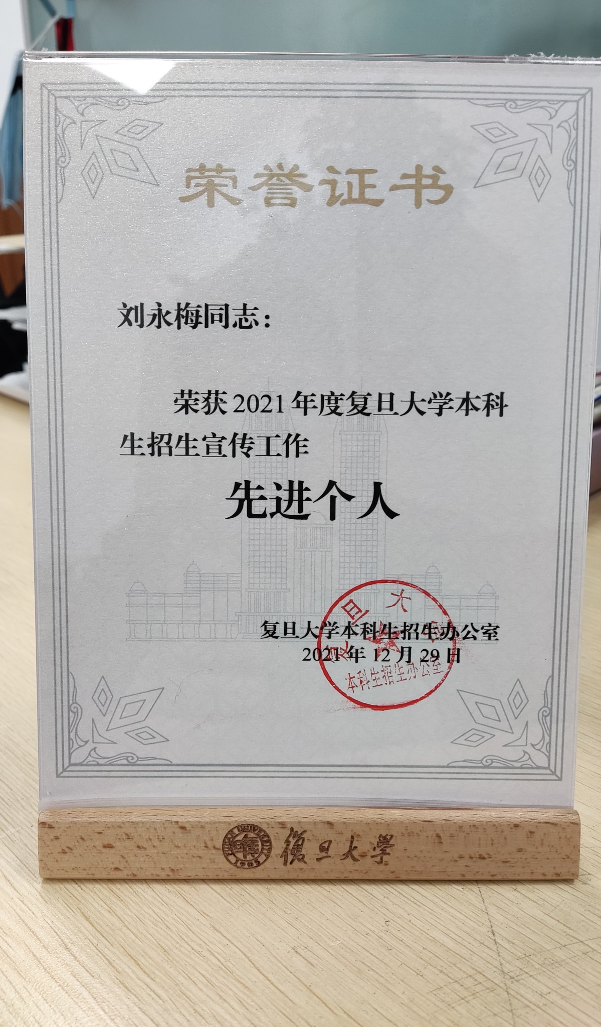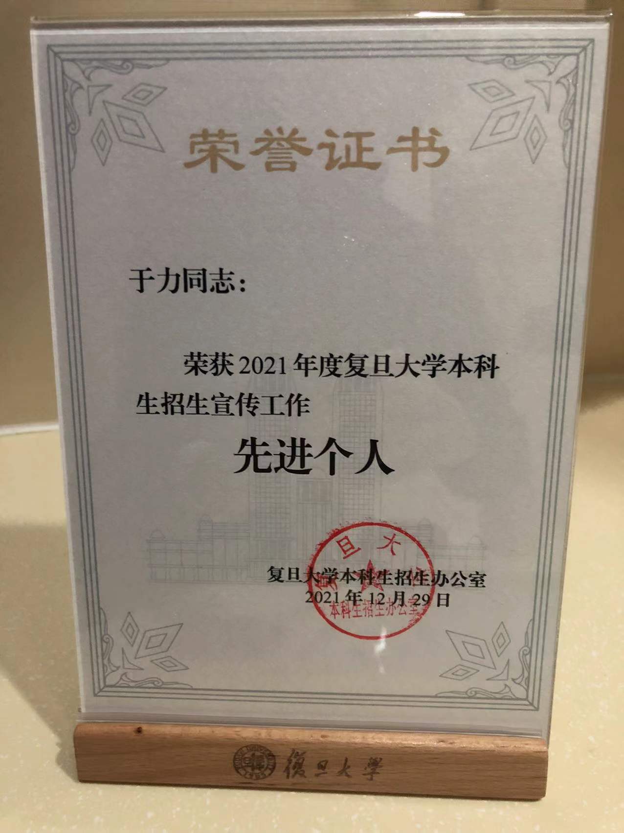 山东招生组在2021年度的招生工作中表现突出,荣获“2021年度复旦大学本科生招生宣传工作先进集体一等奖”;我系长期投身一线招生工作的刘永梅老师荣获“2021年度复旦大学本科招生宣传工作先进个人”;于力老师荣获“2021年度复旦大学本科招生宣传工作先进个人”及“十年招生功勋奖”。