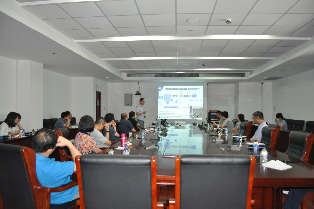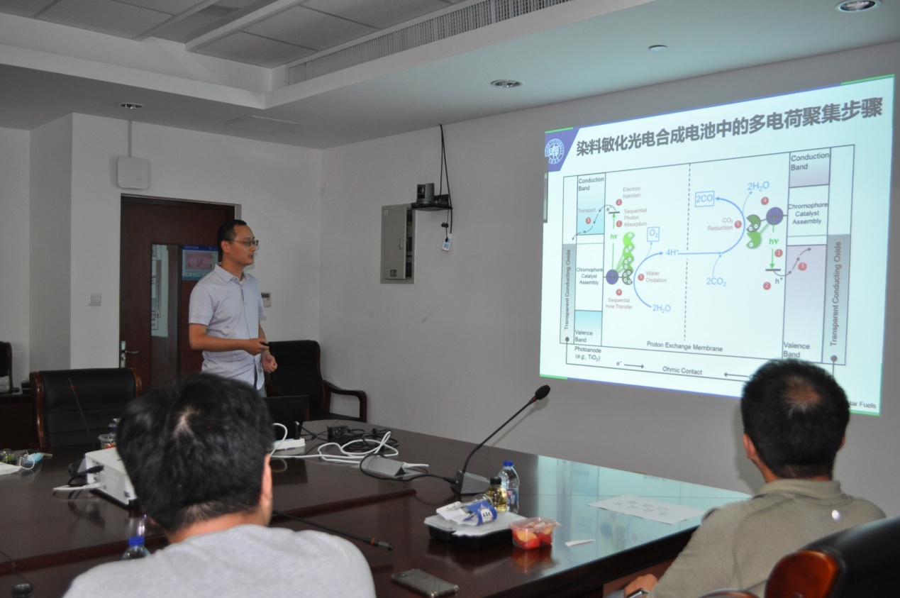沙龙开始,系主任贺鹤勇教授首先致辞,他鼓励青年教师积极参加学术交流,同时,希望资深教授们做好传帮带。本期活动承接首期沙龙活动的形式,采用每期一位青年教师做主题报告,其余参与教师一起交流的方式开展。本期沙龙活动邀请青年研究员胡可作主题报告。胡可老师以“光引发半导体界面多电荷转移反应动力学”为题,介绍了光引发半导体界面多电荷转移的研究背景,着重讲述了目前存在的核心科学问题及针对问题的解决的办法,还讲述了目前取得的科研成果及将要开展的研究计划。