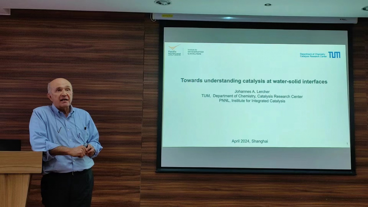在报告中,Lercher教授首先指出,我们正处于重要能源变革之中,他强调不同的能源和资源转化利用过程都涉及化学键重组,而基础表界面催化研究对于理解这些过程至关重要。接下来,Lercher教授重点介绍了以水为媒介的多相催化过程,并着重阐述了如何从物理化学角度理解水分子与固体催化剂表界面的催化作用过程。他指出化学势可以描述分子的反应性,并提出了利用化学势量化催化剂上反应物种的性质的思路。通过定量分析水在分子筛限域空间中的存在形式,发现水在分子筛微孔中只与Brønsted酸中心发生有限的水合过程,并以团簇形式分布在分子筛孔道中。在催化过程中,通过调控团簇间隙中反应物分子的吸附,可以影响催化反应的进行。最后,Lercher教授还将上述研究认识拓展到水相环境的电化学过程,通过pH和电势等,可以对催化过程进行有效调控。报告结束后,现场师生就其研究的方向与内容中遇到的问题与Lercher教授进行深入探讨。