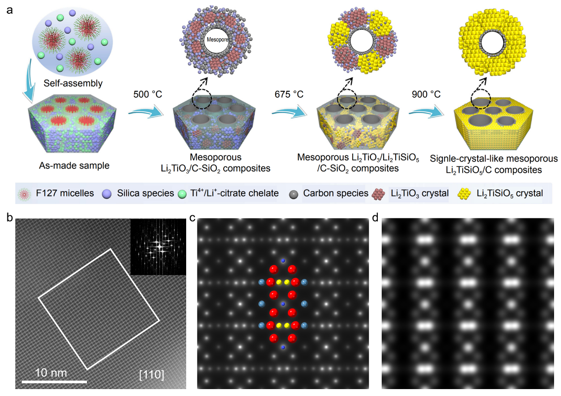 (a) 胶束定向组装合成类单晶介孔Li2TiSiO5示意图;(b-d) 球差矫正HAADF-STEM研究类单晶介孔Li2TiSiO5的原子结构