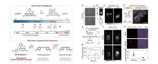 针对上述问题,我系张凡教授团队提出了一种双桥策略,构建了一种新的罗丹明染料骨架,称为2X-罗丹明。在这项工作中,该团队展示了2X-罗丹明的概念验证成果,其中X1为硫(S),X2为C(CH3)2,在715/765 nm展现出强烈的近红外吸收和发射峰,同时具有超过1000 nm的明亮发光拖尾。文中展示了2X-罗丹明染料在高速动态成像和活体内的靶向深层组织分子成像中的优越表现。此外,张凡教授团队还开发了针对HaloTag标签蛋白的近红外荧光配体,即2XR715-HTL,它不仅可用于近红外基因编码的活细胞钙离子传感,还实现了活体脑神经元、肝细胞核的化学遗传学标记。2X-罗丹明染料显著扩展了近红外荧光染料工具库,为化学遗传学方法在活体成像和传感的深入应用奠定了基础。