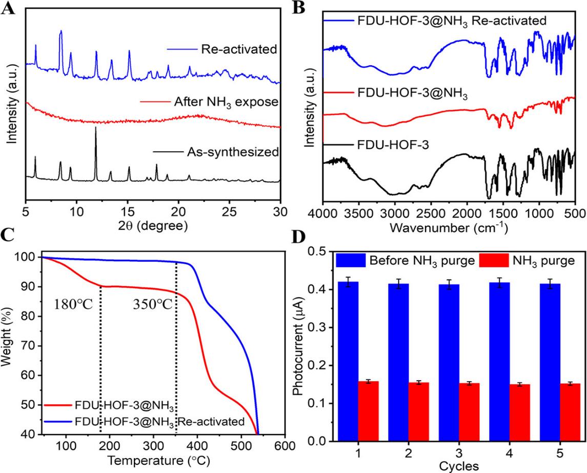 自修复行为已广泛应用于能够进行分子识别的智能感知系统。但是,大多数刚性晶体框架一旦在压力、热量或真空等外部刺激下坍塌,很难在常温下恢复到它们的晶体相。本文报告了一种新型微孔氢键有机框架,FDU-HOF-3 (FDU=复旦大学),其具有用于氨气捕获的自修复行为,并将其与已报道的介孔HOF-101进行了比较。当向孔隙中引入低浓度氨气时,使得HOF变得无序,但在NH3去除后,简单地在真空下加热即可恢复到原始的晶态状态。详细的表征结果显示,这些HOF的可重复自愈合行为是由于羧酸与氨气之间酸碱相互作用,同时伴随着羧酸与羧酸之间氢键的断裂和再生所实现的。FDU-HOF-3在25 mbar时显示出对低浓度氨气的最高吸附能力(8.13 mmol/g)并且在接触250 ppm 氨气不到10秒后,显示出光电流的迅速下降。这些自修复HOF经过超过10个循环的氨气捕获和释放,吸附容量均没有降低。