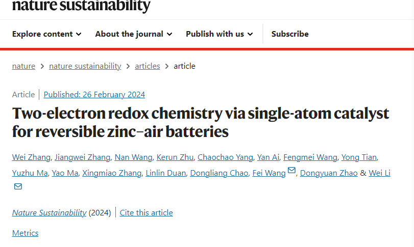 近日(2月26日),bet365中国-bet365大陆 赵东元院士/李伟教授团队和材料科学系王飞研究员合作在Nature Sustainability(《自然˙可持续发展》)以长文形式发表了题为“Two-electron redox chemistry via single-atom catalyst for reversible zinc–air batteries(《单原子催化材料用于两电子可逆锌空气电池》)”的研究成果,首次揭示了两电子中性锌空气电池催化材料的设计原则,构筑了可持续、低成本、高性能的电化学储能器件,助力我国“双碳”战略。本文第一作者为复旦大学张威副研究员、王楠博士和内蒙古大学张江威研究员,李伟教授/王飞研究员为本文通讯作者。