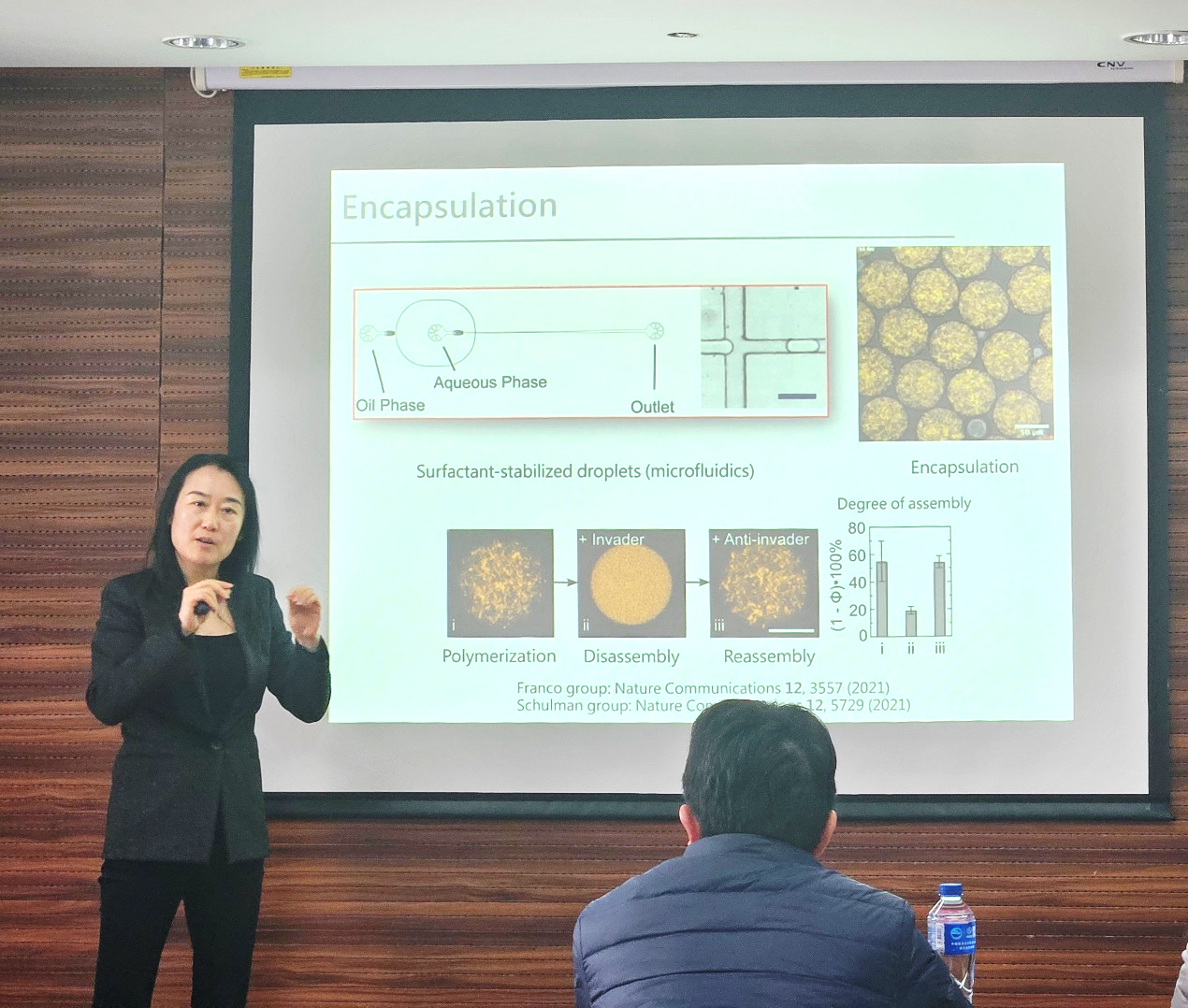 在报告中,刘娜教授首先介绍了DNA折纸技术的基本原理及其在纳米光子学研究中的应用。她指出,该技术非常适合通过分子自组装来构建生物模拟物,或更广泛地说,构建功能结构和材料。通常DNA折纸模板等离子体纳米结构的动态可调性是通过模板本身的重新配置来实现的,然而这种方案只有很少的重新配置状态,而且光学元件被固定在了折纸上。针对这一问题,刘娜教授的团队提出了一种可转化的等离子体螺旋,其中多个金纳米粒子围绕共享的DNA折纸轴移动。刘娜教授对这一新型技术的原理进行了详细介绍。此外,刘娜教授还分享了她的团队在基于功能DNA的细胞骨架用于细胞仿生的最新成果,展示了在细胞大小隔室中建立的基于DNA的细胞骨架。通过合理设计和控制,可以模仿天然细胞骨架的特征,包括可逆组装和ATP触发聚合。此外还探索了细胞骨架在细胞中引导囊泡运输的重要潜力。这项工作巩固了DNA纳米技术在构建合成细胞中的关键作用。问答环节,现场师生积极提问,就技术在理论研究、实际操作过程中遇到的问题与刘娜教授进行了深入探讨和交流。刘娜教授的讲座令在场师生印象深刻,提升了大家对纳米光子学研究的认识。