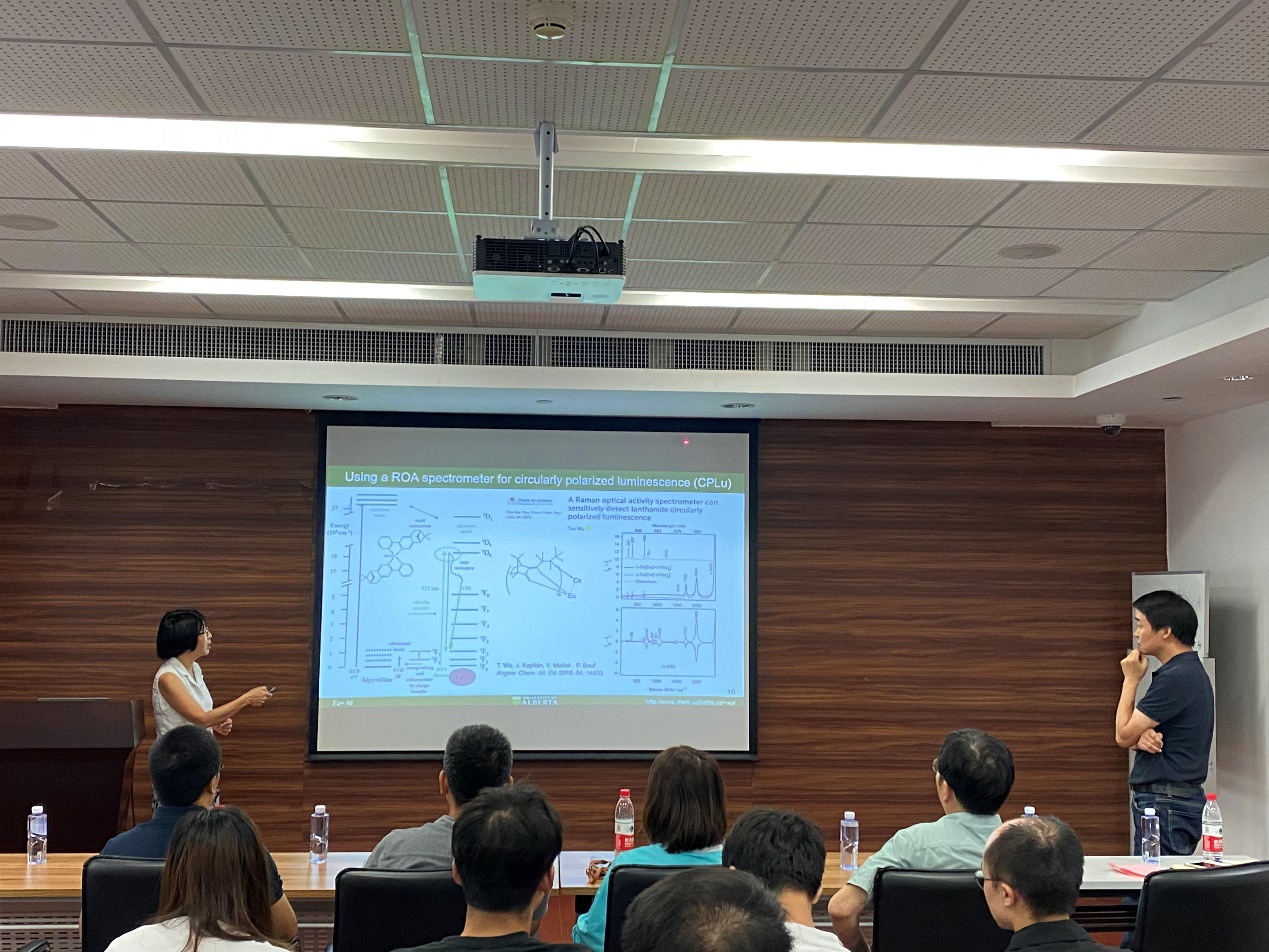 徐云洁教授团队的研究方向之一是对不同尺寸体系的手性识别和转移机制的探究,研究体系包括从手性小分子到原子精确的金属团簇,再到金属纳米颗粒。徐云洁教授首先介绍了他们团队使用的多种新型光谱技术,并详细介绍了他们发现的一种新型的手性拉曼光谱——eCP拉曼光谱及其理论模型的建立。该种光谱将电子的圆二色性与圆偏振拉曼光谱结合,是研究共振条件下手性系统中天然手性和结构性质的一种有效工具之一,能兼具电子圆二色的高手性灵敏度与拉曼光谱的高分辨率。这一新型光谱的发现源于在实验中对镍、铜等几种过渡金属配合物进行拉曼光学活性测量时,检测到非手性溶剂出现强的手性拉曼信号,在对该异常实验现象和作用机制的深入探索和与理论化学家的交流讨论后得到这一惊奇的发现。该结果也解释了之前研究中未考虑到eCP拉曼贡献导致的一些问题。最后,徐云洁教授还介绍了他们团队最近在有机-水界面上进行手性判别的相关研究,利用界面张力测量和分子动力学模拟开展了液-液界面上的手性识别。徐云洁教授的报告深入浅出,引起了师生的极大兴趣。在提问交流环节,师生们积极互动,热烈交流,现场学术氛围浓郁。