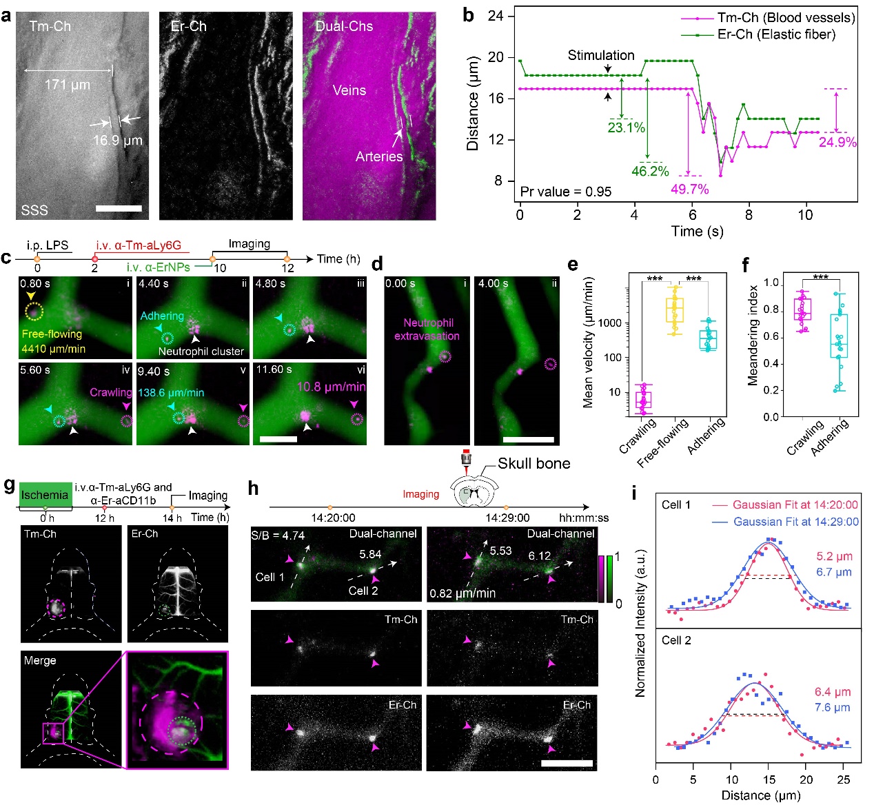 最后,张凡团队在生物组织精细结构水平上验证了该成像技术用于探索深组织生理活动机制的可行性。首先通过对不同近红外稀土荧光探针表面进行功能化修饰,实现了对活体小鼠脑部血管网络中各级血管的区分。团队随后使用激素刺激小鼠来模拟神经对血流的调控作用,利用该成像技术能够在不开辟颅窗的情况下实现对小鼠动脉血管的舒缩运动进行实时动态的监测,有望为血液动力学研究提供更加精准的信息。为进一步探索该成像技术用于活体深组织多重荧光成像的潜力,团队利用开发的新型近红外稀土荧光探针特异性的标记了小鼠的中性粒细胞,通过该成像技术实现了在单细胞水平上的免疫反应监测,能够对单个中性粒细胞在皮下炎症部位及脑损伤部位趋化性、外渗、激活等过程的进行实时动态监测。相比于传统的成像方法,该近红外新型稀土荧光探针及双通道实时成像技术有效避免了开辟视窗造成组织损伤对观测结果带来的干扰,为在活体水平研究细胞免疫反应提供了新的思路。