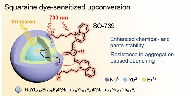 镧系掺杂上转换纳米粒子(UCNPs)由于具有大的反斯托克斯位移、窄的吸收和发射带、优异的光稳定性和不闪烁的特性被广泛应用于生物成像领域,反斯托克斯上转换发光可以最大限度地减少生物样品自发荧光的干扰。然而,由于UCNPs中敏化剂镧系离子(例如Yb3+,Nd3+)的吸收截面比传统有机染料低103–104倍,其实际应用仍然受到上转换发光亮度低的限制。目前主要通过增加镧系离子掺杂浓度,采用惰性壳层抑制表面发光淬灭,调整镧系元素掺杂剂周围局部晶体场以提高上转换发光效率。染料敏化上转换采用高吸收截面的有机近红外(NIR)染料(IR-806)作为天线分子,收集激发光并将能量转移到UCNPs中的镧系离子以实现上转换发光增强。然而,所有用于染料敏化上转换的NIR荧光团,如IR-806和Cy7.5,都是基于花菁骨架,其结构由不同碳原子数的甲川链和两个芳族侧链组成。对于需要使用高激光功率(∼KW/cm2)的单粒子发光测试,由于甲川链的化学稳定性和光稳定性较差,很难获得基于花菁染料敏化的上转换发光。此外,花菁染料在极性溶液中的聚集淬灭,也限制了其增强上转换发光的能力。目前亟需开发一种具有优异化学稳定性和光稳定性且抗聚集诱导淬灭的NIR染料敏化上转换探针。