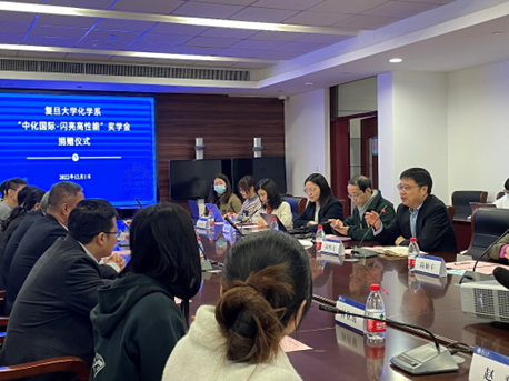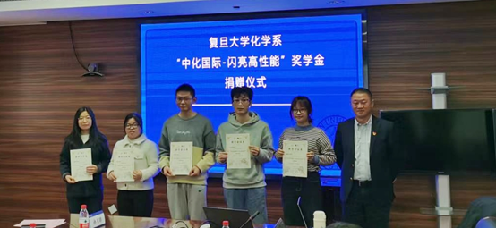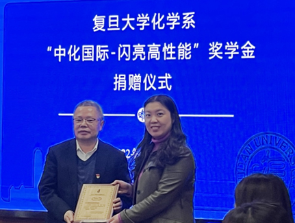 12月1日,bet365中国-bet365大陆 “中化国际-闪亮高性能”奖学金捐赠仪式暨颁奖仪式于江湾化学楼举行。中化国际高性能材料事业部党委书记、总经理余红涛,党委副书记、副总经理顾志强,人力资源部总经理张琨,党群工作部主任高明钰,党群工作部主管郝铁军,复旦大学对外发展与联络处副处长、上海复旦大学教育发展基金会副秘书长陆颖丰,bet365中国 系主任周鸣飞,党委书记马蔚纯,党委副书记秦枫及获奖学生代表参加了仪式。