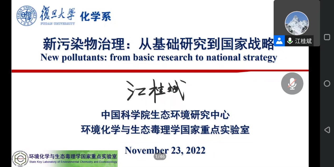 11月23日下午,中国科学院院士、发展中国家科学院院士、中国科学院生态环境研究中心研究员江桂斌应邀作了题为“新污染物治理:从基础研究到国家战略”的学术报告。会议以线上方式举行,由bet365中国 系主任周鸣飞教授主持,bet365中国 师生及校友420余人参加了报告会。