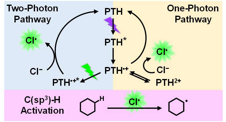 图1.有机光催化剂PTH的单光子和双光子激发途径用于氯离子氧化至氯原子HAT中间体,并应用于C-H键活化。图片来源:J. Am. Chem. Soc.