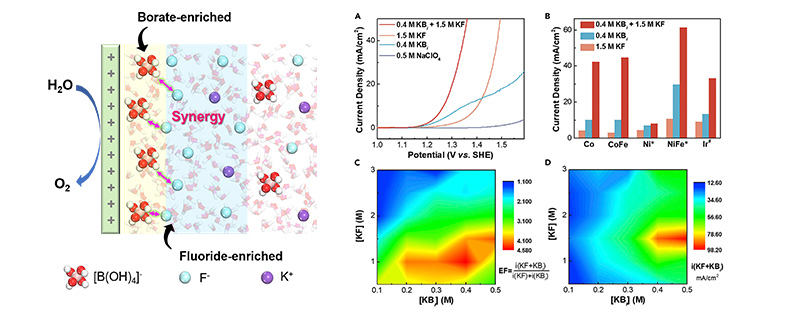 针对这些问题,近日复旦大学龚鸣青年研究员课题组与华东理工大学练成研究员课题组合作发现在中性电解液中同时引入硼酸根离子(Bi-)和氟离子(F-),可改变电极/电解液界面微环境形成分级离子排列结构,进而显著提升中性析氧反应(OER)性能。研究发现使用易合成的Co(OH)2催化剂时,使用F-:Bi- =1.5:0.4的比例可产生强协同效应,比单阴离子添加的情形活性可提高接近一个数量级。在高载量Co(OH)2的电极上可在1.791 V vs. RHE的电位下电流密度可达100 mA/cm2,并能够实现14天的稳定运行。反应动力学测试、探针辅助原位拉曼光谱以及分子动力学模拟证明F-会打破水的氢键网络,使得Bi-更靠近电极表面,处于内亥姆霍兹层,而F-会处于离电极较远的外亥姆霍兹层,形成分级离子排列结构。这种结构能够强化局部电场并加速电极表面的质子转移,从而提高了中性析氧反应的活性。该研究不仅为电催化复杂界面结构的设计和优化提供了新的视角和思路,而且为更为高效的中性电催化过程提供了更多的可能性。