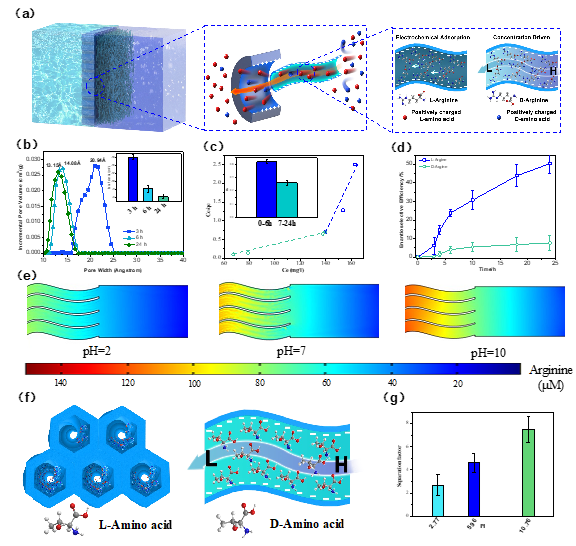 在该工作中,孔彪教授团队开发了一种新颖的超组装手性异质薄膜构筑策略,并首次提出耦合加速筛分机制,该异质薄膜器件可同时实现高灵敏度离子以及手性分子的智能筛分。