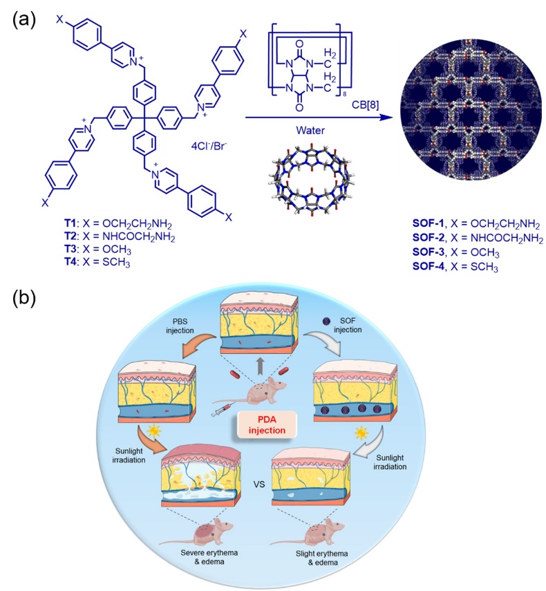 图1. (a)SOFs的结构和组装示意图。(b)SOF加速PDA清除和抑制其光敏作用的示意图。