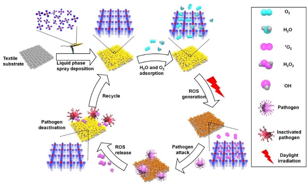 生物威胁(Biological threats),包括高传染性的细菌、病毒和毒素,甚至致命性的生物战剂,已经严重威胁到全球公共安全,夺去了数百万人的生命,扰乱了社会秩序,并极大地破坏了全球的经济。由于生物威胁爆发的偶然性和新流行病的持续传播,对生物威胁的防护目前仍然是一项严峻的挑战。开发能够物理阻断和化学消杀病原体的自清洁抗菌涂层是应对这项挑战的可行方案。然而,传统的有机杀菌剂或无机纳米粒子属于消耗品,且十分昂贵,长期使用使细菌产生耐药性。与之相比,能够产生大量活性氧物种(ROS)的光敏材料成本更低,可重复使用,应用更广泛。