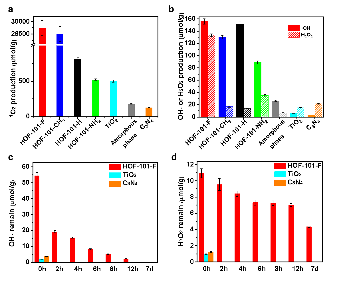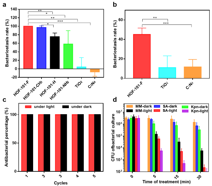 研究团队发现,HOF-101-F涂层在ROS的生成性能上明显优于其他几个HOF涂层和非晶态的H4TBAPY涂层,并远超传统的自清洁涂层材料TiO2和C3N4。通过近红外(NIR)发射光谱和自旋共振(ESR)等实验,证实了HOF孔内吸收的氧气可以通过光照生成单线氧1O2和其他活性氧物种。由于HOF纳米孔环境的保护,这些活性氧物种能够长时间的保存。在模拟日光照射下,仅2.5分钟HOF-101-F涂层杀灭了近95%的大肠杆菌。同时HOF-101-F涂层在普通光照2小时,黑暗环境存放12小时后,仍然具有不俗的灭菌性能。此外,HOF-101-F涂层在光照和暗处理5个周期后依然表现出出色的灭菌性能。最重要的是,HOF-101-F涂层在日光下30分钟内,对常见的致病性细菌,如肺炎克雷伯氏菌菌株、金黄色葡萄球菌菌株和海洋分枝杆菌菌株等的杀菌效果均超过99.99%。该工作为进一步发展自发活性生成和储存的抗菌涂层材料提供了一种新策略。