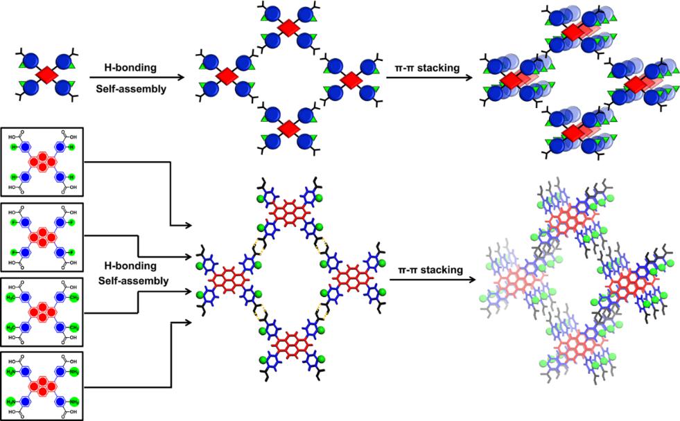此外,通过晶体工程学方法引入不同的取代基,包扩甲基(HOF-101-CH3)、氨基(HOF-101-NH2)和氟(HOF-101-F),可以制备出一系列具有相同网络结构的HOF材料。这些HOF利用LPSD方法可以轻松地涂覆在纤维织物上以形成HOFs/纤维复合材料,并且纤维上的HOF涂层保持了常规HOF的结晶度和孔隙率。不同官能团的化学修饰对HOF材料的疏水性、吸收光谱和荧光光谱都产生了明显的影响。