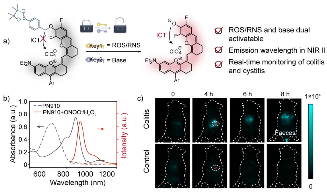 碱性环境对于生命活动的维持至关重要,碱性组织中的炎症若得不到及时的诊断和治疗可能会造成严重的后果。例如在碱性组织中,膀胱炎可能会引发肾结石,而肠炎早已被世界卫生组织认定为最难治疗的疾病之一。活性氧(ROS)和活性氮(RNS)是炎症的信号分子,其中过氧化氢(H2O2)和过氧亚硝酸根(ONOO-)是这两类活性物质的主要组成成份。如何在活体中实现碱性环境中ROS和RNS的特异性检测,成为碱性组织炎症诊断的重点。