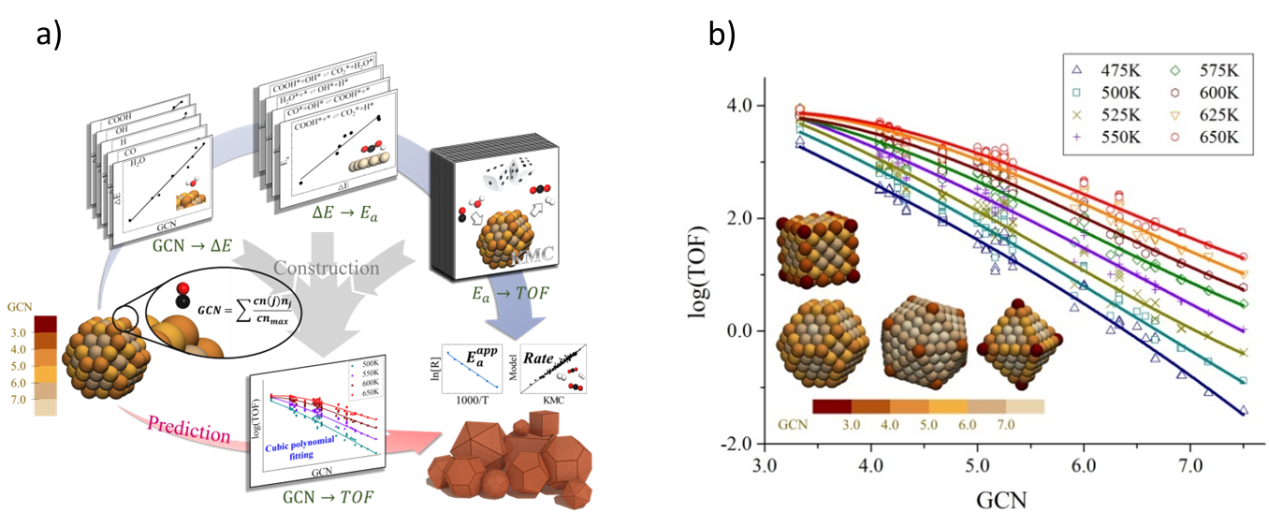 在多相催化中,催化剂颗粒的尺寸和形貌会极大的影响催化活性,因此其结构-活性关系是多相催化研究中的核心问题之一。催化剂活性由表面电子结构决定,因而多数“结构-活性”研究都集中在构建“结构-能量”关系这一部分。从能量关系出发,通过求解微动力学模型,可以得到反应速率等动力学信息。对于多相催化中常见的纳米催化剂,目前最有效的微动力学模型是动力学蒙特卡洛模拟(KMC),但受制于计算量,其应用通常被局限于小粒径的纳米颗粒(<5nm)研究中。如果能够跨越DFT计算和KMC模拟步骤,直接构建催化剂表面活性位点的“结构-活性”关系,将大幅提升催化剂设计与筛选的效率,有力地扩展第一性原理在多相催化研究中的应用范围。