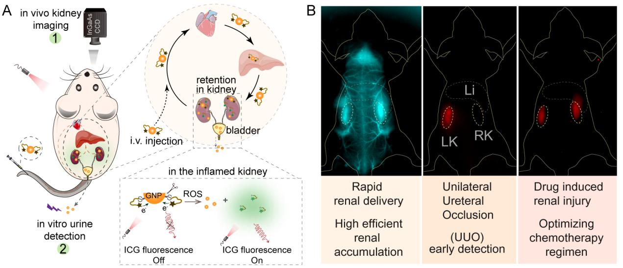 图1. (A)多肽介导的NIR-II荧光探针用于肾损伤成像示意图。(B)多肽介导的肾靶向NIR-II探针成像与早期肾损伤检测结果。
