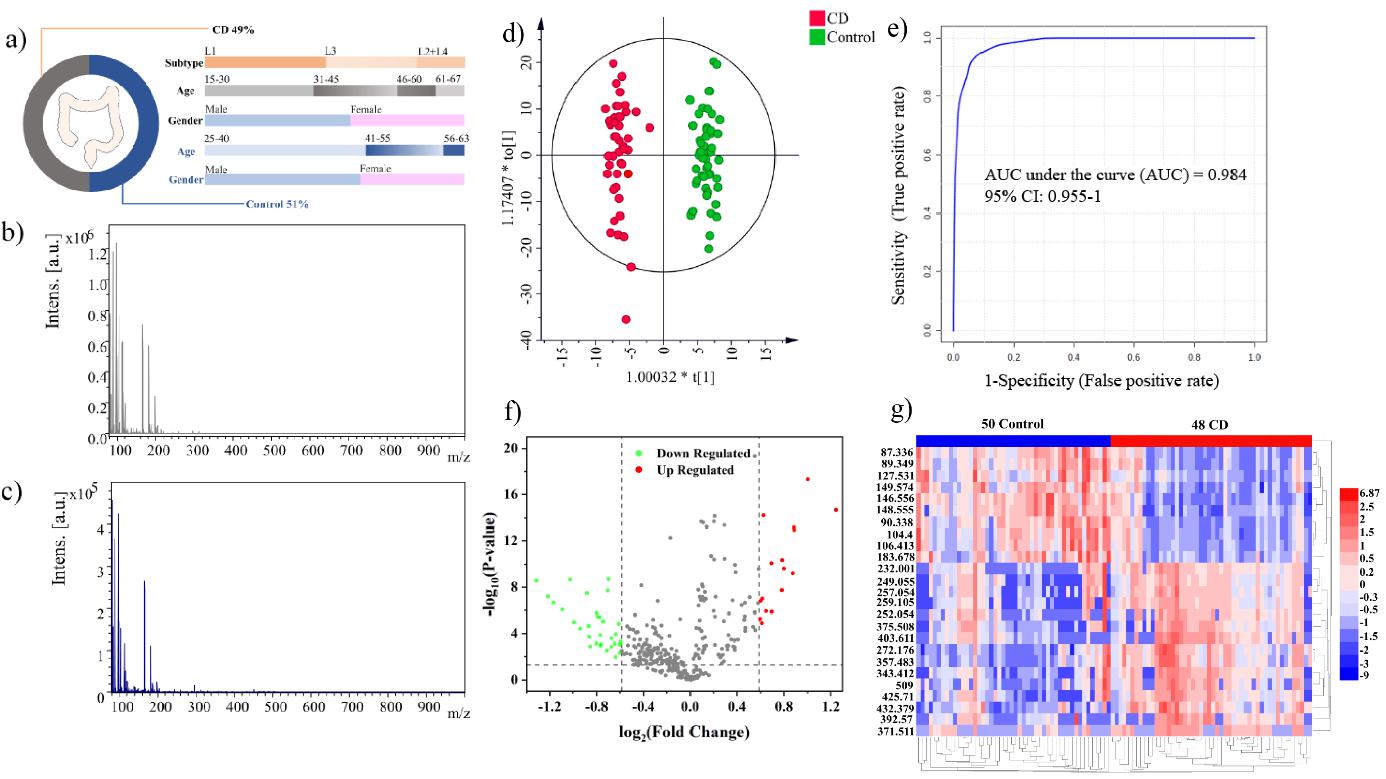 图1(a)克罗恩病组与对照组血清样本的性别、年龄分布。典型的克罗恩病血清(b)和健康对照血清(c)的代谢指纹图谱。(d)克罗恩病与对照组的OPLS-DA模型。(e)区分克罗恩病患者与健康对照组的ROC曲线。(f)健康对照组与克罗恩病代谢物差异火山图。(g)25种特征差异代谢物分布热图。