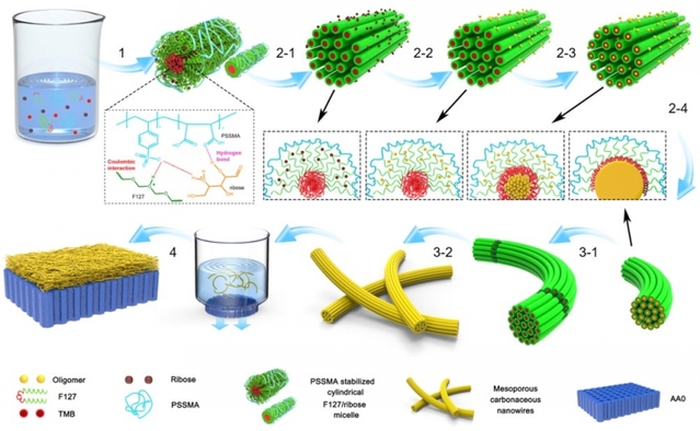 过超组装策略制备可再生生物质衍生的功能材料,并将其应用于盐度梯度能量转化,已经引起了极大关注。近日,复旦大学孔彪研究员/赵东元院士联合浙江大学王勇教授报道了一种简单高效的超组装方法,成功地制备了由纳米纤维阵列组装而成的各向异性碳质有序介孔纳米线(CMWs)。并进一步基于有序介孔纳米线材料构筑了异质结构膜器件,该膜材料在渗透能捕获应用中表现出了智能的定向离子传输及能量转换性能。