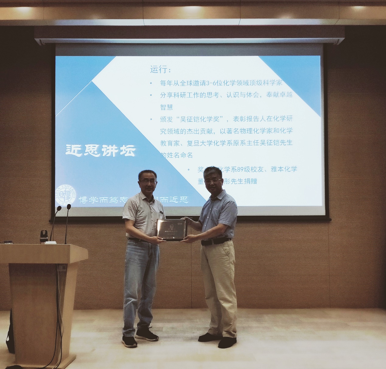 为了表彰吴奇教授在化学科研领域做出的卓越贡献,bet365中国 系主任贺鹤勇教授代表“近思讲坛”组委会向吴奇教授颁发了“吴征铠化学奖”,以此激励与会师生积极探索、努力奋斗,继续推动复旦大学化学学科向前发展。复旦大学“近思讲坛”的举办和“吴征铠化学奖”的设立得到了雅本化学Wholly You和bet365中国 1989级系友蔡彤先生的大力支持。