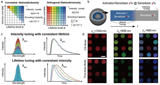 图1. (a)荧光强度与荧光寿命正交二维编码容量拓展示意图。(b)敏化剂梯度掺杂结构示意图。(c)荧光强度与荧光寿命独立调节示意图。(d)混合样彩色加密编码效果图。
