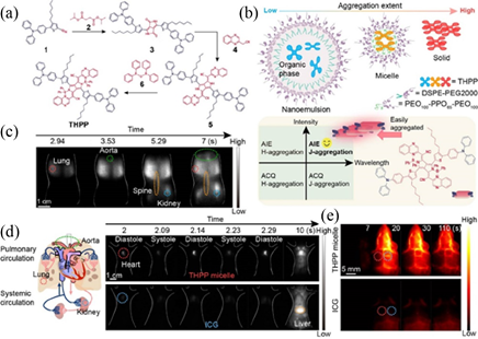 图1(a)THPP合成路线。(b)THPP胶束、纳米乳、固体状态示意图。(c)THPP胶束用于小鼠脏器高帧率成像。(d)THPP胶束用于小鼠心脏跳动的检测。(e)对比THPP胶束与ICG监测小鼠脑部侧枝循环。