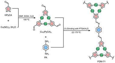 通过溶剂热法得到水合三吡唑甲醛合铜(I)配合物,基于单晶X射线衍射确定其为三核Cu(I)与吡唑基团配位形成的平面三角形分子。简单的研磨法可使此配合物作为具有C3对称性的构筑单元与具有C2对称性的对苯二胺发生席夫碱反应,得到同时具有金属–吡唑配位键和亚胺共价键的MOF结构FDM-71。通过结构模拟FDM-71的两种具有不同堆叠模式的二维蜂窝状网络结构(重叠式堆叠和交错式堆叠)。结合粉末X射线衍射数据精修和77 K氮气吸附和孔径分布分析,确定FDM-71为具有AA堆叠模式的六方二维层状结构。FDM-71具有直径约为26 Å的一维贯穿孔道。