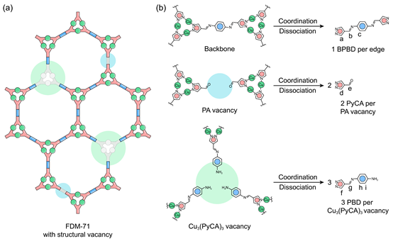 利用FDM-71同时具有金属–吡唑配位键和亚胺共价键的特点,我们发展了仅断裂铜–吡唑配位键,确保亚胺共价键稳定的MOF解离方法。利用溶液相核磁共振谱确定MOF解离后不同有机组分的种类和数目,并建立不同有机组分与不同类型结构缺位的对应关系,推导出FDM-71中的结构缺位的种类和浓度。FDM-71中同时存在约24.2%的对苯二胺基元缺位和2.8%的三吡唑甲醛合铜基元缺位。