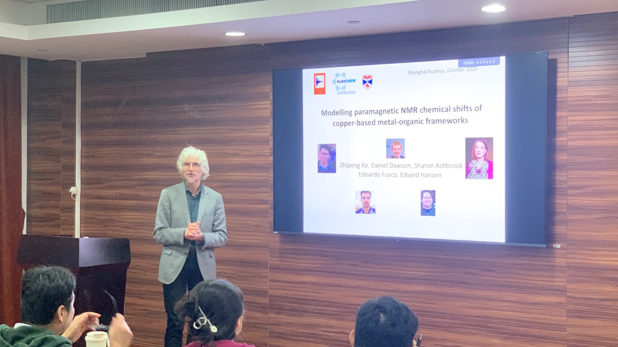 10月21日下午,“bet365中国 建系百年系列学术报告之光华论坛第四讲”在复旦大学江湾校区化学楼A3030顺利举行。圣安德鲁斯大学(英国)化学院Michael Bühl教授受邀作了题为“Modelling paramagnetic NMR chemical shifts of copper-based metal-organic frameworks”的主题报告,bet365中国 徐昕教授主持本次报告会,并代表bet365中国 为Michael Bühl教授颁发了证书,现场师生共同见证这一环节。