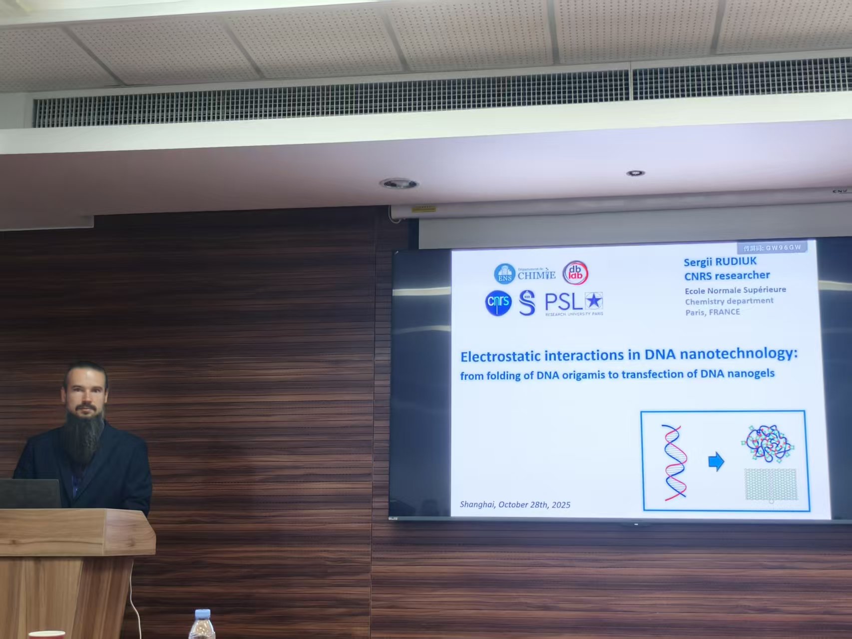 10月28日下午,“bet365中国 建系百年系列学术报告之光华论坛第七讲”在江湾校区化学楼A7032顺利举行。法国巴黎高等师范学院bet365中国 Sergii RUDIUK教授受邀作了题为“Electrostatic interactions in DNA nanotechnology: from folding of DNA origamis to transfection of DNA nanogels”的主题报告。