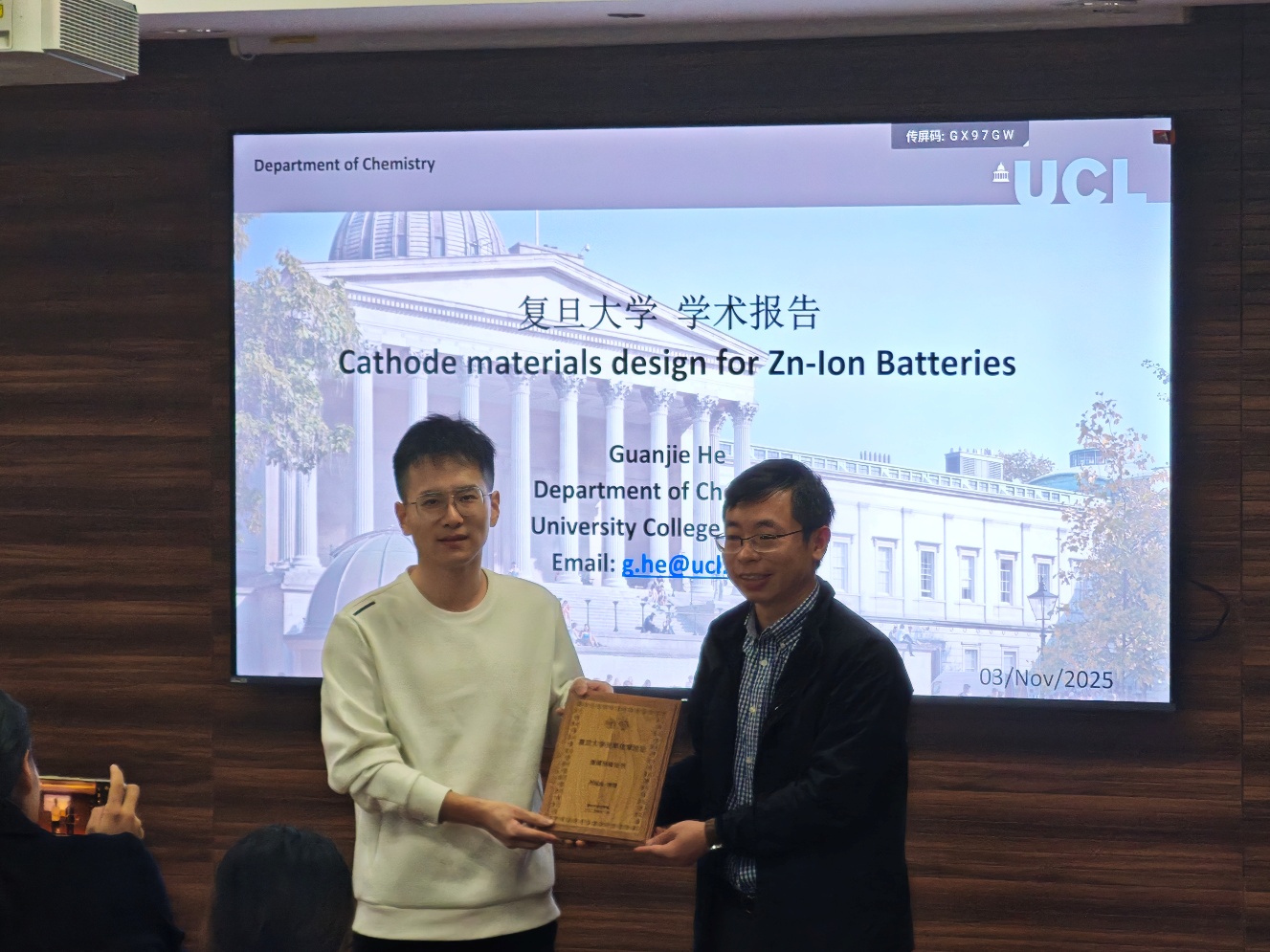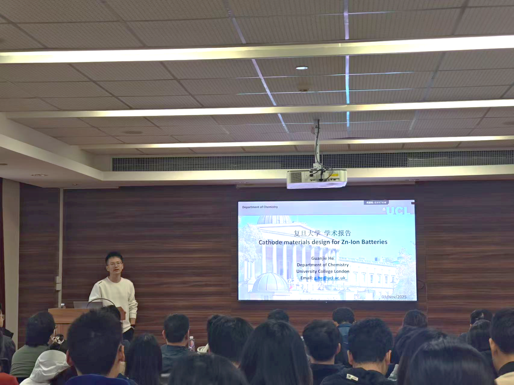 11月3日下午,“bet365中国 建系百年系列学术报告之光华论坛第八讲”在江湾校区化学楼A7032报告厅顺利举行。本次论坛特邀伦敦大学学院何冠杰教授作了题为“高性能水系锌离子电池的正极材料设计”的学术报告,bet365中国 李伟教授主持报告会,并代表主办方为何冠杰教授颁发荣誉证书,现场近百名师生参与交流,共同聚焦水系锌离子电池领域的前沿技术与研究突破。
