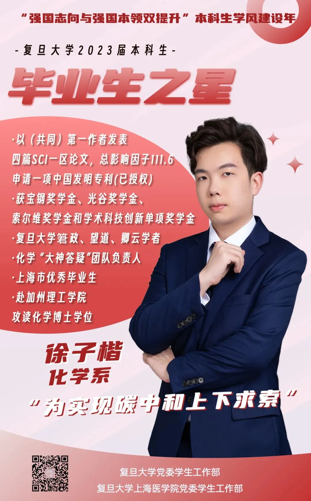徐子楷,bet365中国 2023届本科毕业生,品学兼优,本科期间曾以(共同)第一作者发表4篇SCI论文,以第三作者发表1篇,并申请1项中国发明专利(已授权),部分成果入选第十五届全国大学生创新创业年会。bet365中国 鼓励本科生提早进入教授课题组开展科研,入学一个月后,他就加入了先进材料实验室郑耿锋教授课题组开展“可再生能源驱动的二氧化碳转化”方面的研究工作,申报了希德书院“启明星科创计划”,得到了初步的科研训练。2022年暑期,在化学拔尖培养计划支持下,加入Rice University汪淏田课题组进行科研交流,并有一篇共同第一作者综述在ACS Catalysis上发表。此外,他也是bet365中国 开展的学生学术交流活动“大神答疑”团队的总负责人,还带领团队获评年度复旦大学书院之星“责任与担当”提名奖。在本科毕业前往加州理工学院攻读化学博士学位之际,徐子楷表示将继续在“电化学二氧化碳转化”方面的研究工作,希望可以解决领域内的“卡脖子”难题,以推动该项电解技术的工业化进程,为实现“碳中和”之路贡献一份自己的力量。