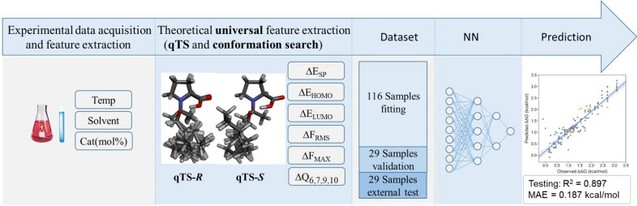 深度学习在对映选择性预测方面展现出了巨大潜力,现有预测模型通常需要大量稳态结构描述符以及大规模数据,并面临描述符选择的困难。引入基于准过渡态(quasi transition state, qTS)的描述符提供了一种缓解这些挑战的可能途径。然而描述符选择的挑战仍然存在。为此李志铭、张俊良教授团队提出了一种基于类过渡态通用描述符(universal descriptor, UD)的新型小数据机器学习模型(UD-qTS),将两个非对映异构类过渡态之间的关键属性差别,包括类过渡态单点能(ESP)、前沿分子轨道能量(EFMO)和核心原子电荷(QATOM),作为通用描述符。该模型有效性已用脯氨酸及其衍生物催化的分子间aldol反应以及Pd催化的Negishi反应进行了验证。仅用小维度描述符集(12个描述符,其中3个实验变量、9个理论通用描述符)、小数据量训练数据(分别为143和30个反应),以及Matlab内嵌的简单前馈神经网络(aldol反应为两个隐藏层、5+2个隐藏神经元,Negishi反应为一个隐藏层、6个隐藏神经元)进行拟合,外部测试的MAE可低至0.187 kcal/mol,R2高至0.897,与大数据量机器学习模型相当。此外在该模型中,他们还首次提出了一种使用笛卡尔力来纠正类过渡态和真实过渡态之间差异的新方法。这种UD-qTS策略避免了繁琐的大规模描述符探索和筛选,可操作性,为小数据驱动的对映体选择性预测提供了一种高效的选择。鉴于训练模型原理类似,该模型也可用于有机化学反应中其他选择性的预测,如化学选择性和区域选择性等。当然,与大数据量的机器模型相比,由于训练样本容量不够大,模型难以兼顾拟合与预测能力,继续拓展训练样本容量,覆盖更多反应条件、底物和催化剂,可以预见模型表现会有进一步的提升。