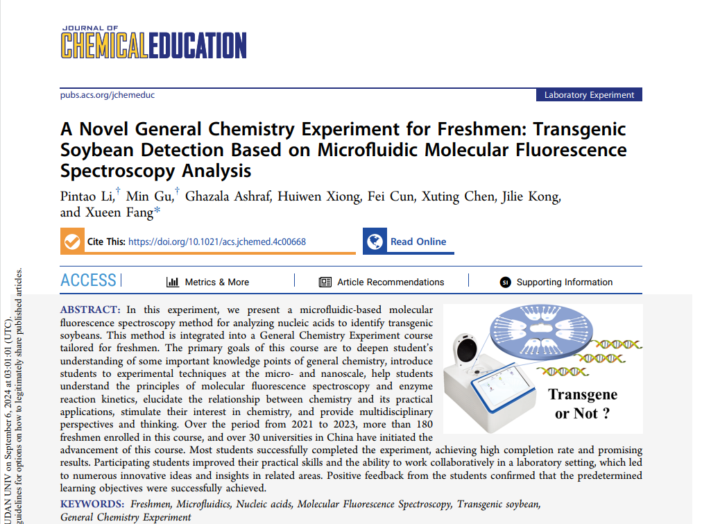 近日,美国化学会旗下的《Journal of Chemical Education》(JCE)以封面文章形式发表了我校bet365中国 教师的重要教学研究成果“A Novel General Chemistry Experiment for Freshmen: Transgenic Soybean Detection Based on Microffuidic Molecular Fluorescence Spectroscopy Analysis”(J. Chem. Educ. 2024, DOI: 10.1021/acs.jchemed.4c00668)。该教学研究旨在通过将微流控前沿技术打造成适合大学化学本科学生开展的实验教学课程,帮助学生更好地理解化学学科的基本原理、掌握化学相关基础实验操作、增强本科生对前沿科学进展的理解。近年来,对于化学实验教学越来越注重多学科交叉思想以及学习兴趣方面的培养,因此开发更具创新性、前沿性、多学科融合性的本科实验教学、促进“双一流”学科的发展意义重大。JCE自1924创刊,是全球化学教育首屈一指的旗舰SCI期刊,该论文的发表实现了我校微流控化学教学研究在国际教育类顶级期刊上的重要突破。