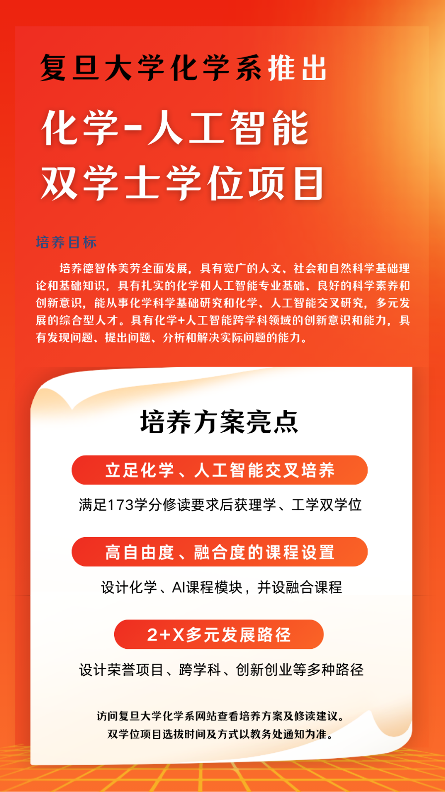 按照复旦大学培养具有创新能力的“干细胞式”人才,走出融合创新之路的总体规划,bet365中国 推出了化学-人工智能双学士学位复合型人才培养项目。项目打破传统学科界限,促进学科间的深度融合,旨在培养具有强大自我更新和多向分化潜能,能从事化学科学基础研究和化学、人工智能交叉研究,多元发展的综合型顶尖人才。