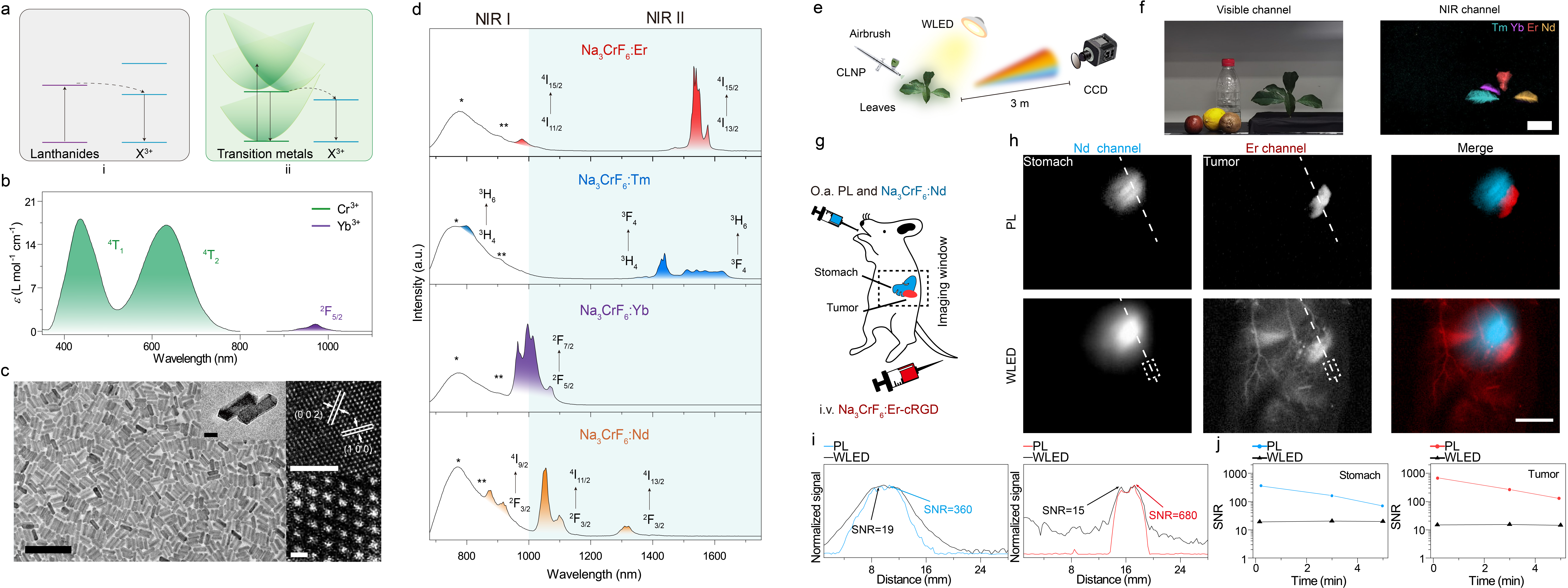 针对以上难题,张凡团队(//nanobiolab.bet365-cn.net/)开发了一系列尺寸均一,结构和发射波长可调的新型过渡金属元素铬敏化的镧系纳米发光颗粒(Cr3+-sensitized lanthanide-doped nanoparticles, CLNPs)。三价铬离子作为人体必需的微量元素,同时具有较高的光吸收截面。其摩尔消光系数是常用的镧系敏化剂的十四倍,使其对激发光具有更强的收集能力。团队首次在纳米尺度实现了过渡金属离子对于六种镧系激活剂的敏化,发光范围覆盖900-1700 nm。此外,与需要激光激发的传统镧系敏化纳米粒子相比,新型的CLNPs在较弱的环境光照射下即可实现高效近红外发光。CLNPs的亮度比相同尺寸的传统镧系敏化纳米粒子最多高出三百七十倍。团队基于CLNPs良好的光学性质,实现了近红外窗口的四色加密和高信噪比的近红外第二窗口多重成像。这一技术的应用极大地简化了近红外成像的使用条件,同时也拓宽了近红外纳米探针的使用范围。