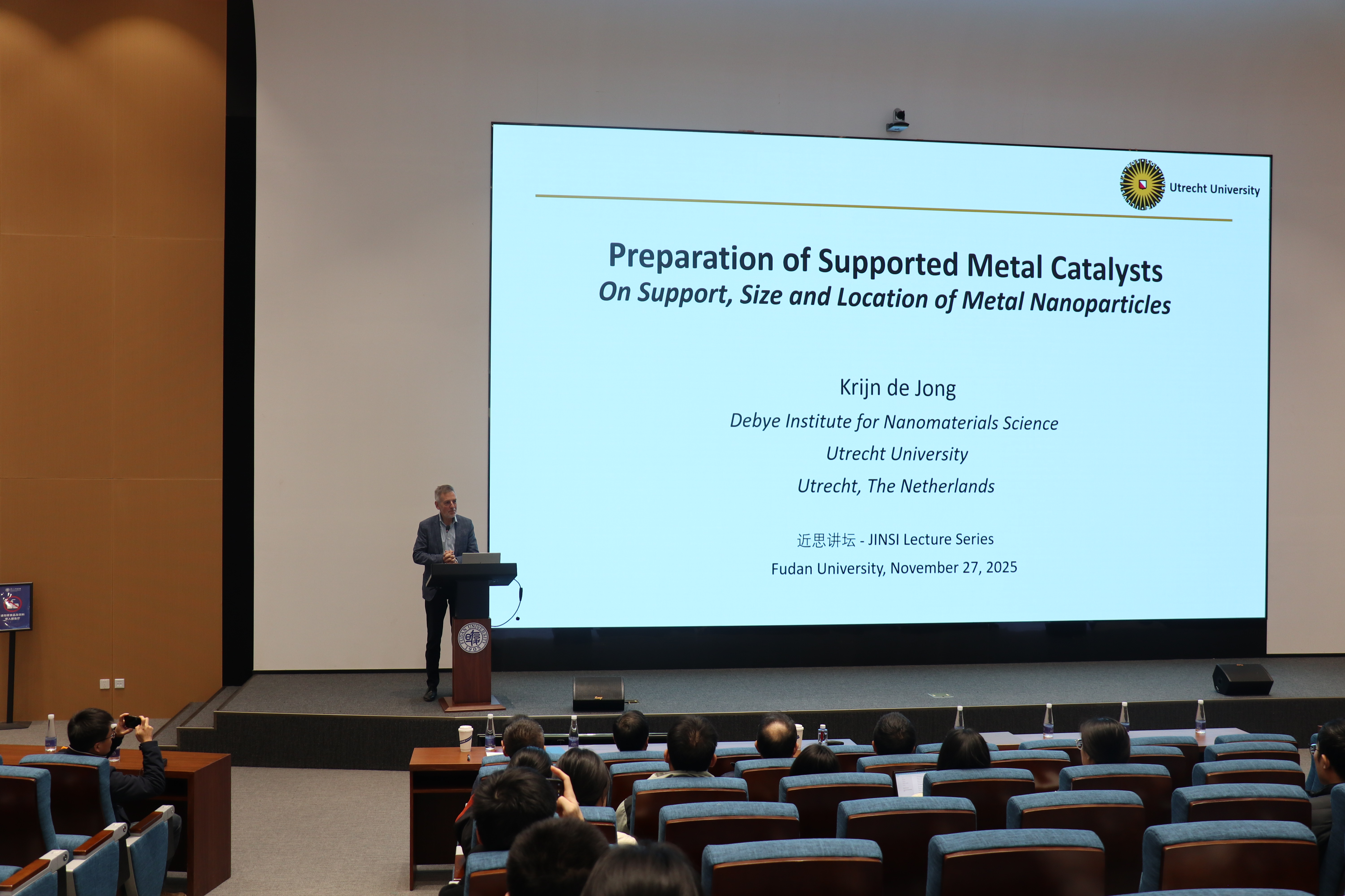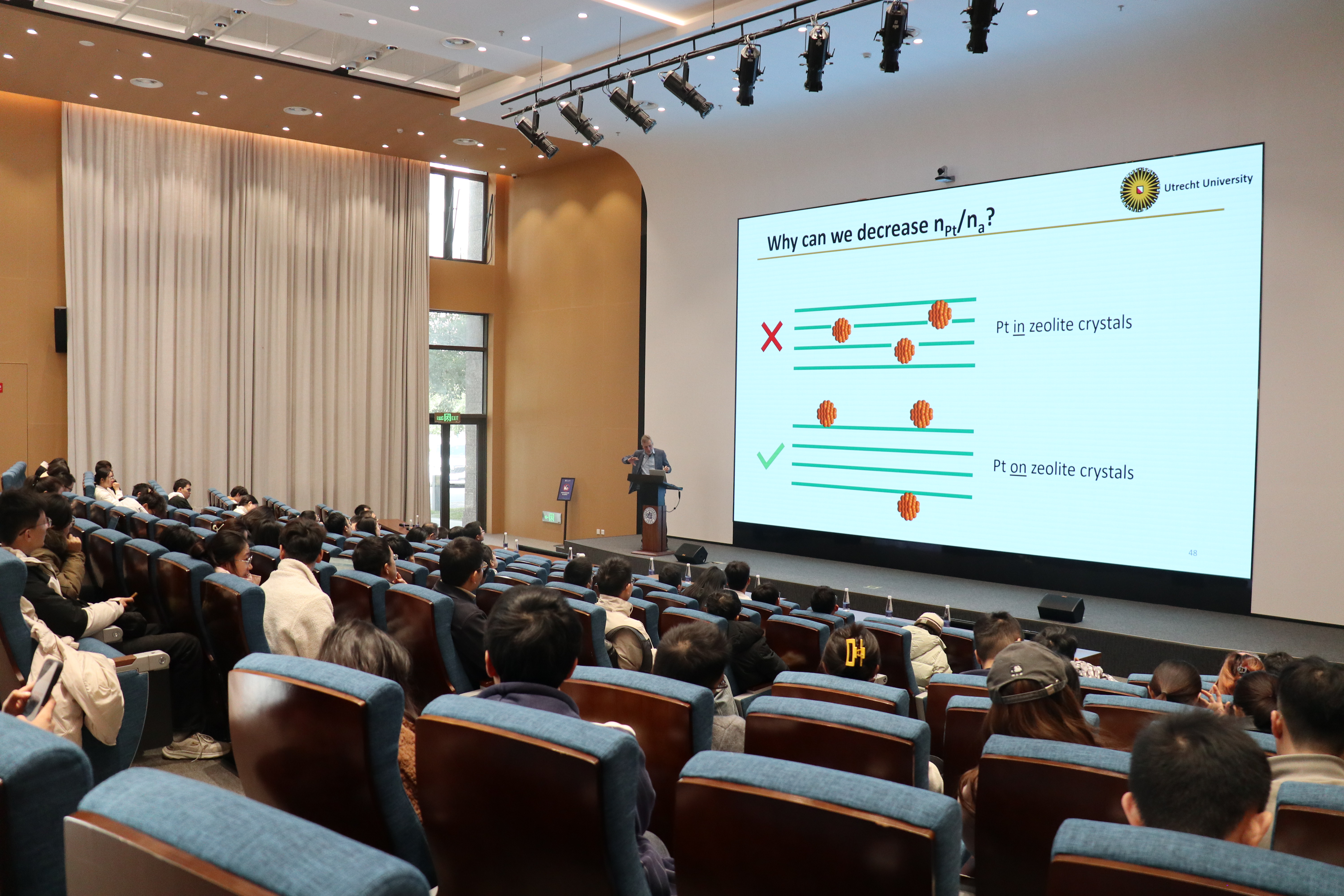 de Jong教授报告主要介绍了其课题组近年来针对多相催化领域中催化剂载体的影响、活性金属颗粒尺寸大小及其在载体上分布位置的研究进展。报告首先对载体对于活性影响进行了简要的介绍,随后以多级孔沸石和沸石负载金属的双功能催化剂为例,重点介绍了其可控合成及其催化反应。