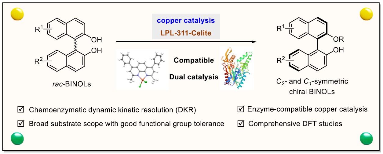 近日,我系朱灿课题组报道了一种在中性金属配合物体系中引入“增强配位”的策略,来解决金属-酶的兼容性问题:中性配体提供π*轨道,允许过渡金属额外的d电子形成反馈π键,从而显著增强配体和金属之间的配位效应。并由此开发了一种高效的酶法DKR方法,实现了外消旋体转化为光学活性轴手性联萘酚化合物:铜盐与菲罗啉BCP配体现场配位,可兼容性地与脂肪酶LPL-311-Celite进行协同催化,完成了一系列功能化的C2-和C1-对称性的轴手性联芳基萘酚的合成,突破动力学拆分产率限制的同时,实现了良好到优秀的对映选择性。值得注意的是,作者报道可从2-萘酚单体出发,利用一锅法(one-pot)方法实现了氧化偶联-DKR的级联反应,这展现了使用非固定配体(unfixed ligands)的优势。机理研究和DFT计算表明,联萘酚的消旋化是通过双去质子化的自由基-阴离子中间体进行的,这一中间体允许较低能垒的轴向旋转。该工作展现了中性金属催化剂策略在酶法不对称合成中的潜在广泛应用。