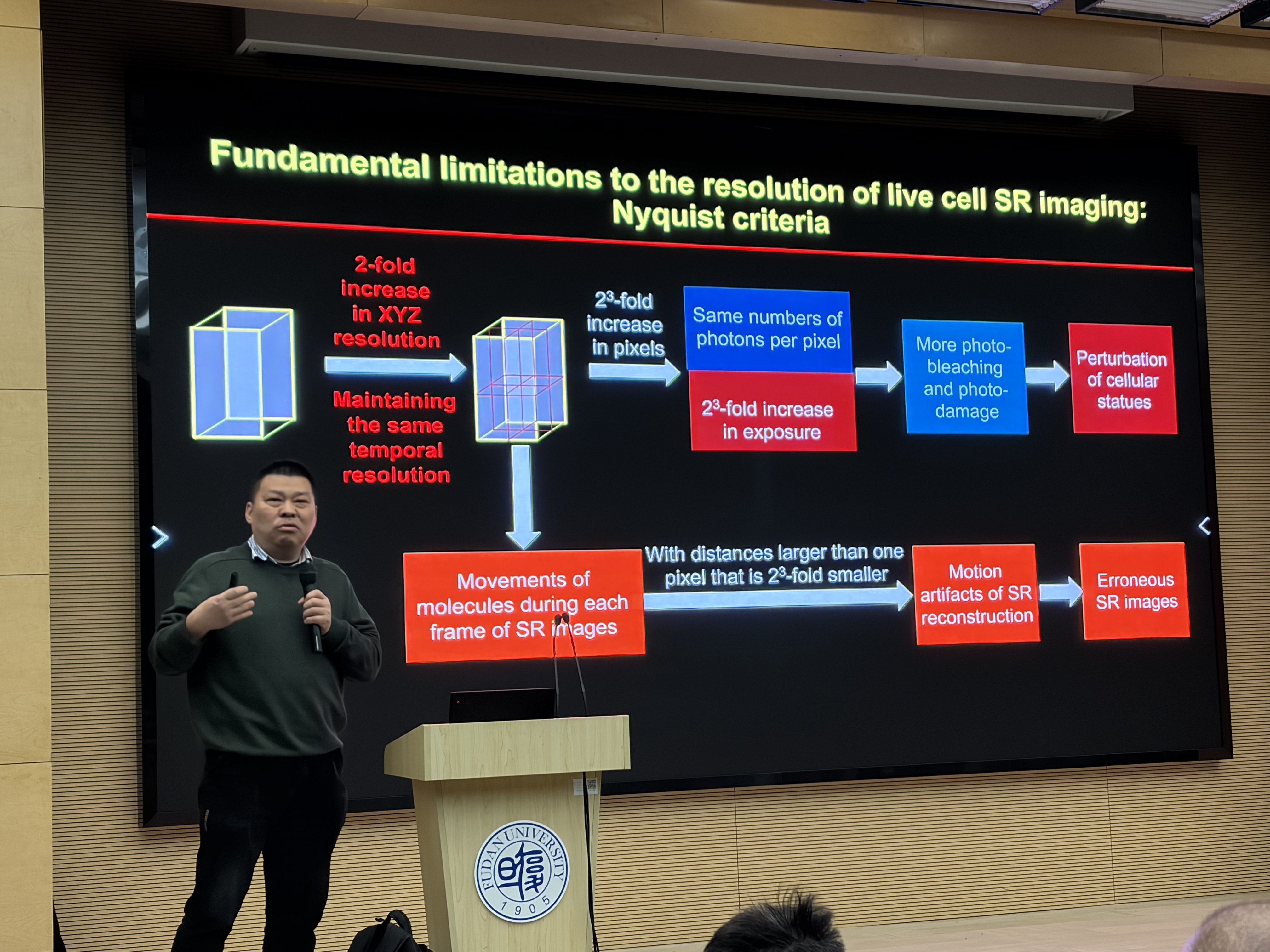 陈良怡教授分享了课题组在超分辨率显微成像领域的代表性成果。针对“如何进一步提高活细胞超分辨成像的空间分辨率”与“如何开发通用方法在不同模态显微镜上提高分辨率”两个关键问题,深入浅出地介绍了光路搭建与算法开发的最新进展。与此同时,陈良怡教授进一步介绍了此技术在生物学研究中的应用,例如动态观察胰岛组织结构中胞吐-胞吞过程的时空耦合,揭示组织学新机制。