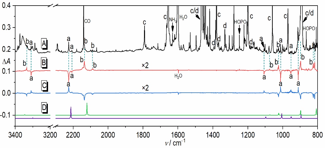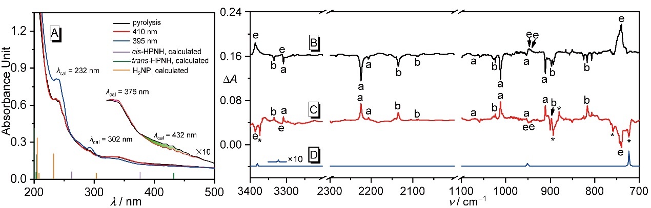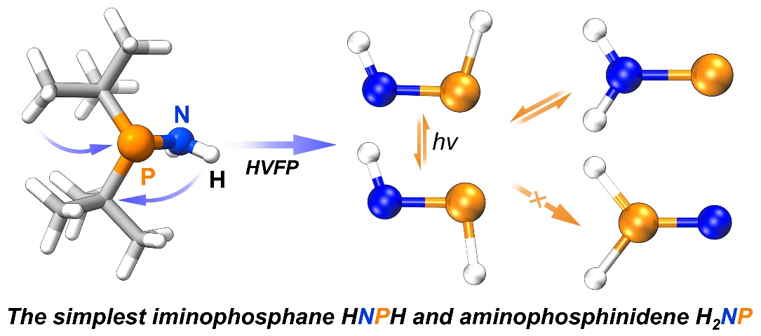 近期,bet365中国-bet365大陆 曾小庆教授、王丽娜副研究员团队通过自主研制的高真空闪光热解HVFP装置,以二叔丁基磷胺为前体,气相高温热解(~950 K)成功制备了HPNH。结合基质隔离红外和紫外可见吸收光谱表征、同位素标记实验和高精度理论计算,证实HPNH存在顺、反两种构象异构体,首次获得其指纹光谱数据。进一步通过选择性光激发,诱导两种构象之间的可逆转化。