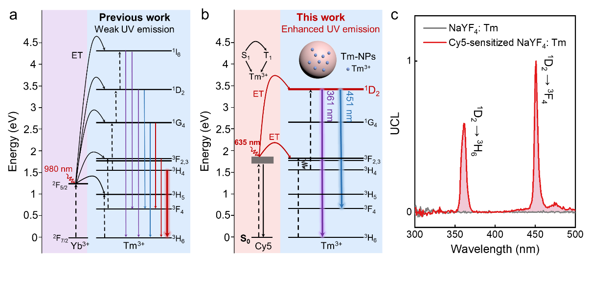 可避免会受到交叉弛豫和表面猝灭的严重影响,使紫外发光效率在机制层面存在内在限制,尤其在小尺寸纳米颗粒中更加显著。针对这一问题,研究团队不再依赖Yb3+作为能量桥梁离子,而是引入花菁染料Cy5作为天线分子捕获能量。在635 nm激发下,Cy5吸收光子后,将能量直接传递至Tm3+的3F2,3中间能级,通过两个光子的能量传递过程高效布居1D2激发态,产生361 nm紫外和451 nm蓝光发射。该策略实现了对Tm3+目标能级的“定向供能”,显著减少能量耗散。在最优染料浓度条件下,NaYF4: 2%Tm体系获得最高敏化效率,紫外发光增强达近三个数量级,相比传统的980 nm激发体系获得了显著提升。