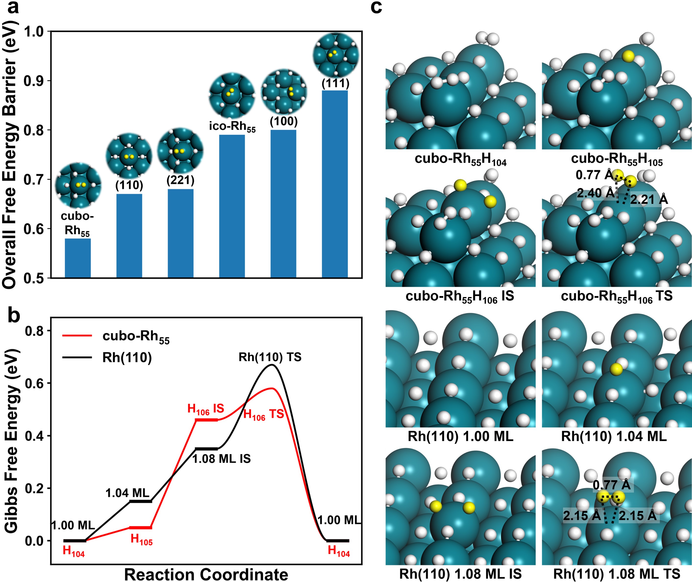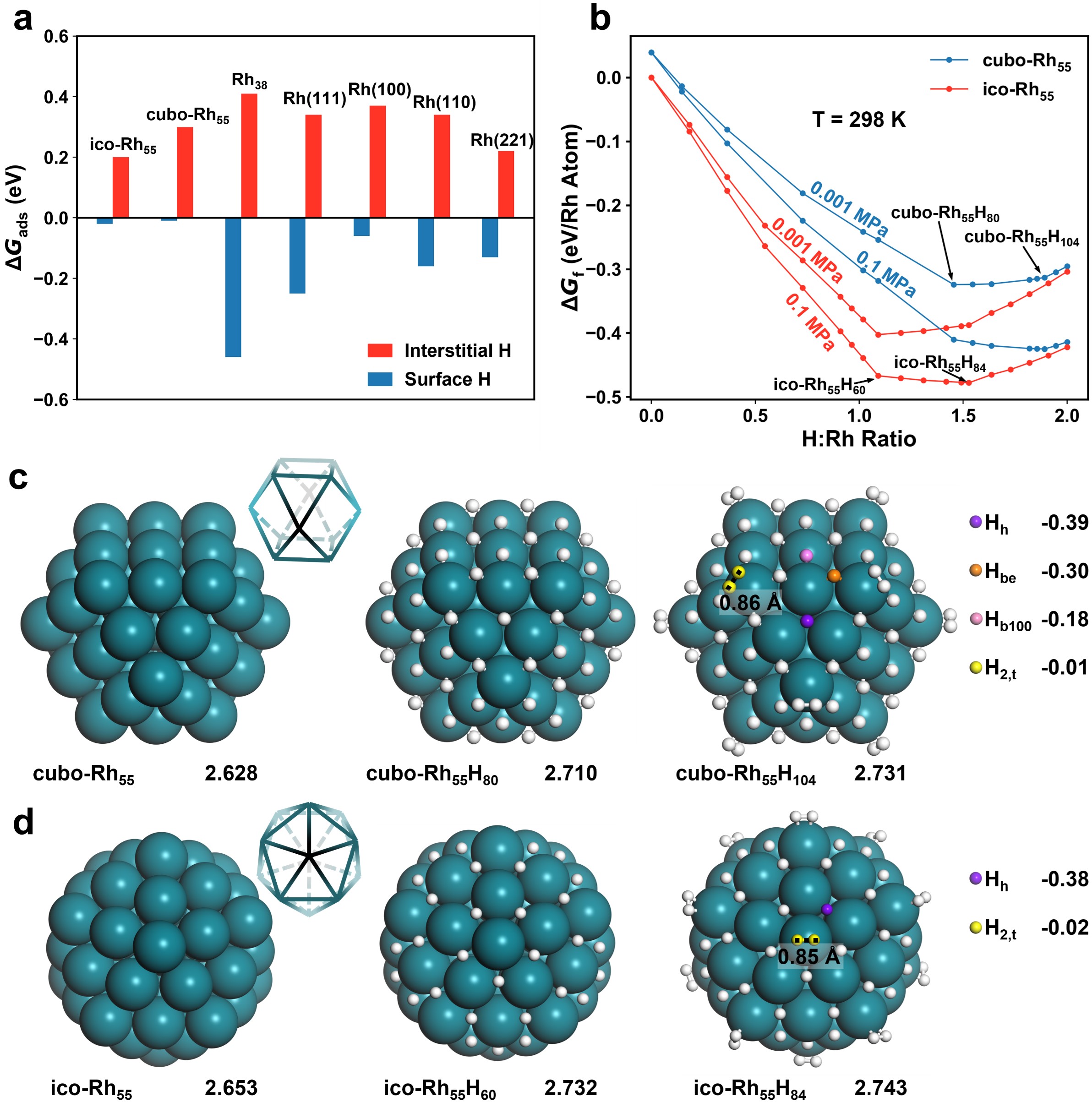 研究团队利用基于人工智能原子模拟LASP软件的全局势能面搜索方法(www.lasphub.com),对 Rh-H 体系的体相、表面相和纳米团簇相进行了大规模结构搜索,分别覆盖超过 360,000(体相)、560,000(表面相)和 800,000(团簇相)种可能结构。如图1所示:在常温常压下,Rh 体相氢化物RhHx的生成自由能为正值,热力学上不稳定。在纳米级 Rh 团簇(如 cubo-Rh₅₅ 和 ico-Rh₅₅)中,H 原子仅吸附在表面,不会进入 Rh 晶格。虽然吸附的 H 原子会导致 Rh 晶格膨胀,Rh-Rh 的平均键长增加约 0.1 Å,但未形成体相氢化物。